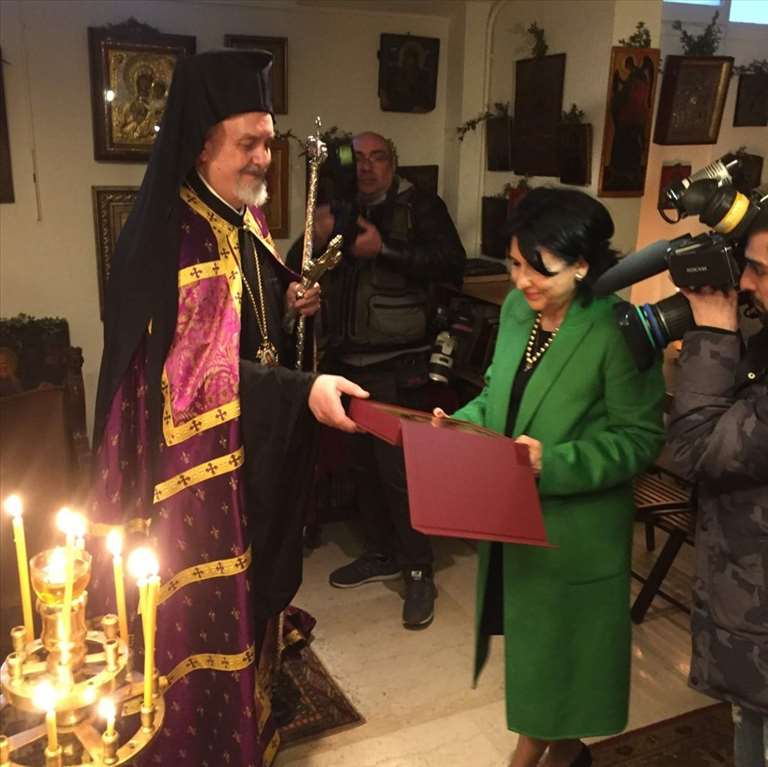 Ο Σεβασμιώτατος καλωσόρισε την κ. Πρόεδρο στην ενορία της Αγίας Νίνας η οποία υπάγεται στο Οικουμενικό Πατριαρχείο και στην Ιερά Μητρόπολη Γαλλίας εδώ και 90 χρόνια. Υπογράμμισε ότι ο πατέρας της κ. Προέδρου είναι ένας εκ των ιδρυτών της ενορίας και εξέφρασε την υπερηφάνεια της κοινότητας και της Ιεράς Μητροπόλεως, που η κ. Zurabishvili ανήλθε στον υψηλότατο βαθμό της Προέδρου της Γεωργίας.