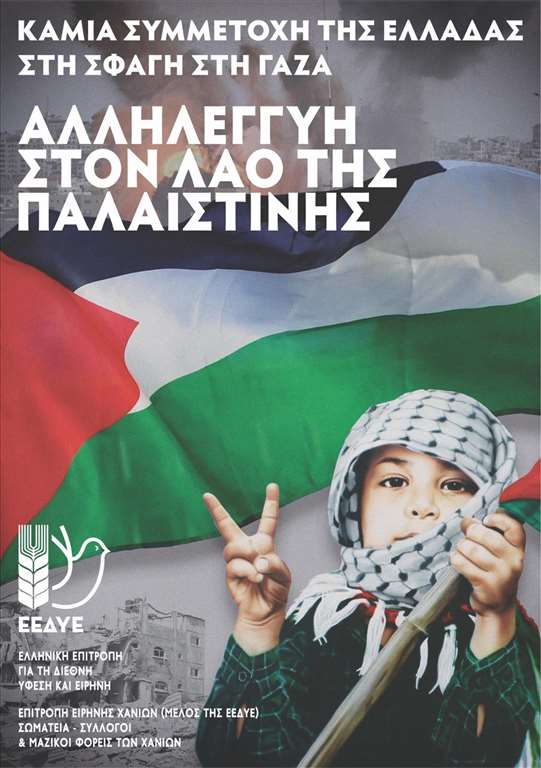 Έναν σταθμό στην κλιμάκωση του αγώνα ενάντια στο μακελειό που συντελείται από το κράτος-δολοφόνο του Ισραήλ στην Παλαιστίνη, αποτελεί η μεγάλη συναυλία το Σάββατο 4 του Νοέμβρη στις 19:30 στο Γυαλί Τζαμί. Τη συναυλία αποφάσισαν και οργανώνουν η Επιτροπή Ειρήνης Χανίων, τα σωματεία και οι φορείς που συμμετείχαν στη σύσκεψη της Τετάρτης 1/11 στο Εργατικό Κέντρο. Συνεχώς πληθαίνουν ωστόσο οι συμμετοχές σωματείων και φορέων που με αποφάσεις τους συμπορεύονται και συστρατεύονται σε αυτό τον αγώνα!