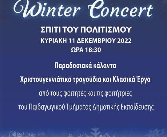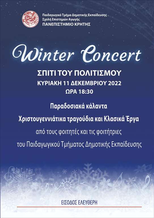 Το Παιδαγωγικό Τμήμα Δημοτικής Εκπαίδευσης του Πανεπιστημίου Κρήτης διοργανώνει συναυλία των φοιτητών και φοιτητριών του με έργα οργανικής και Χριστουγεννιάτικης χορωδιακής μουσικής, με τίτλο «Winter Concert», υπό τη διεύθυνση του μέλους ΕΕΠ του τμήματος, κ. Κυριακής Τριχάκη. Η συναυλία, η οποία εντάσσεται στο πρόγραμμα των χριστουγεννιάτικων εκδηλώσεων του Δήμου Ρεθύμνου, θα πραγματοποιηθεί την Κυριακή 11 Δεκεμβρίου 2022, στο Σπίτι του Πολιτισμού (Βερνάρδου Εμμανουήλ 12, Ρέθυμνο) (ώρα έναρξης 18.30).