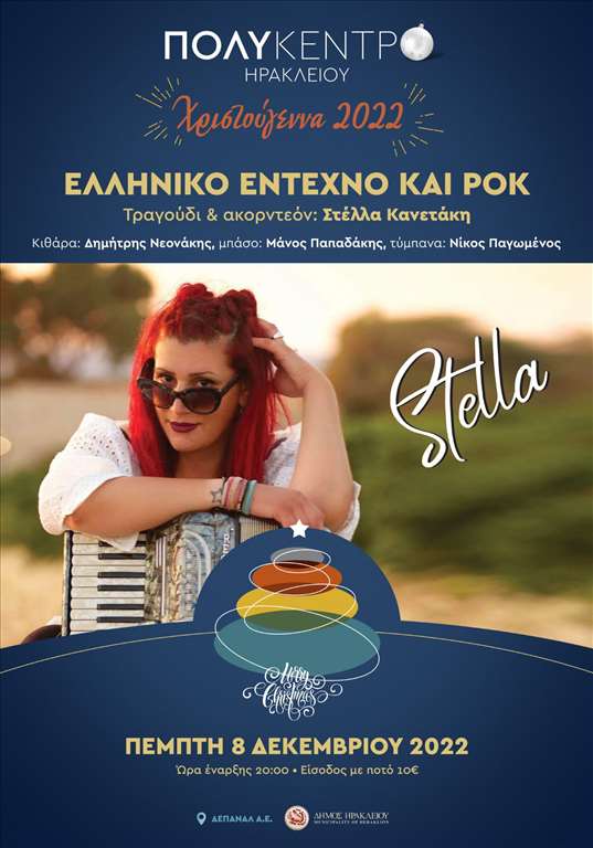 Οι χριστουγεννιάτικες εκδηλώσεις στο Πολύκεντρο Ηρακλείου συνεχίζονται την Πέμπτη 8 Δεκεμβρίου στις 20:00 με την Στέλλα Κανετάκη και το ακορντεόν της, σε μία μοναδική συναυλία!