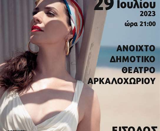 Το Σάββατο 29 Ιουλίου 2023 στις 21.00 μ.μ., στο ανοιχτό Δημοτικό Θέατρο Αρκαλοχωρίου, θα παρουσιαστεί η μουσική συναυλία με ερμηνεύτρια την Φωτεινή Δάρρα.