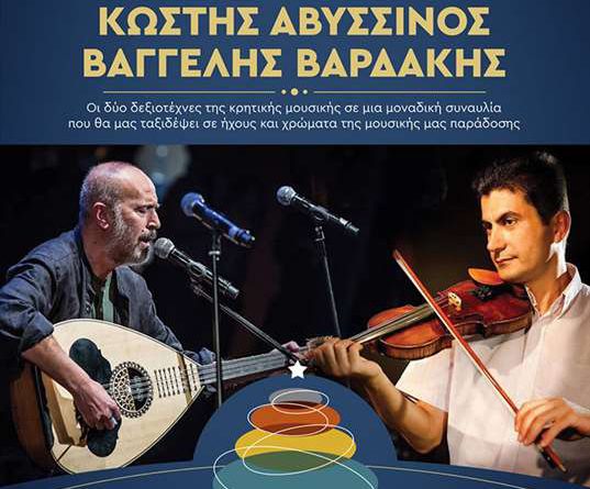 Την Πέμπτη 15 Δεκεμβρίου στις 20:00 το βράδυ στο Πολύκεντρο Ηρακλείου οι χριστουγεννιάτικες εκδηλώσεις συνεχίζονται με τον Βαγγέλη Βαρδάκη και τον Κωστή Αβυσσινό με ήχους και χρώματα της μουσικής παράδοσης!