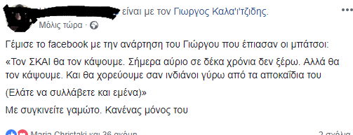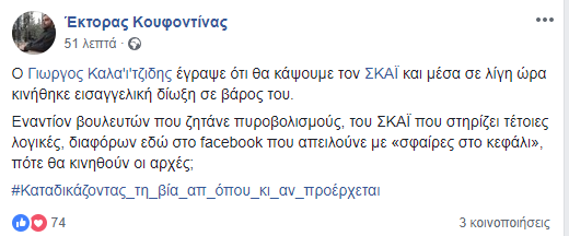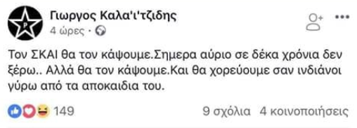 Στην ανάρτηση αναφέρεται: «Τον ΣΚΑΙ θα τον κάψουμε. Σήμερα αύριο σε δέκα χρόνια δεν ξέρω. Αλλά θα τον κάψουμε. Και θα χορεύουμε σαν ινδιάνοι γύρω από τα αποκαΐδια του».