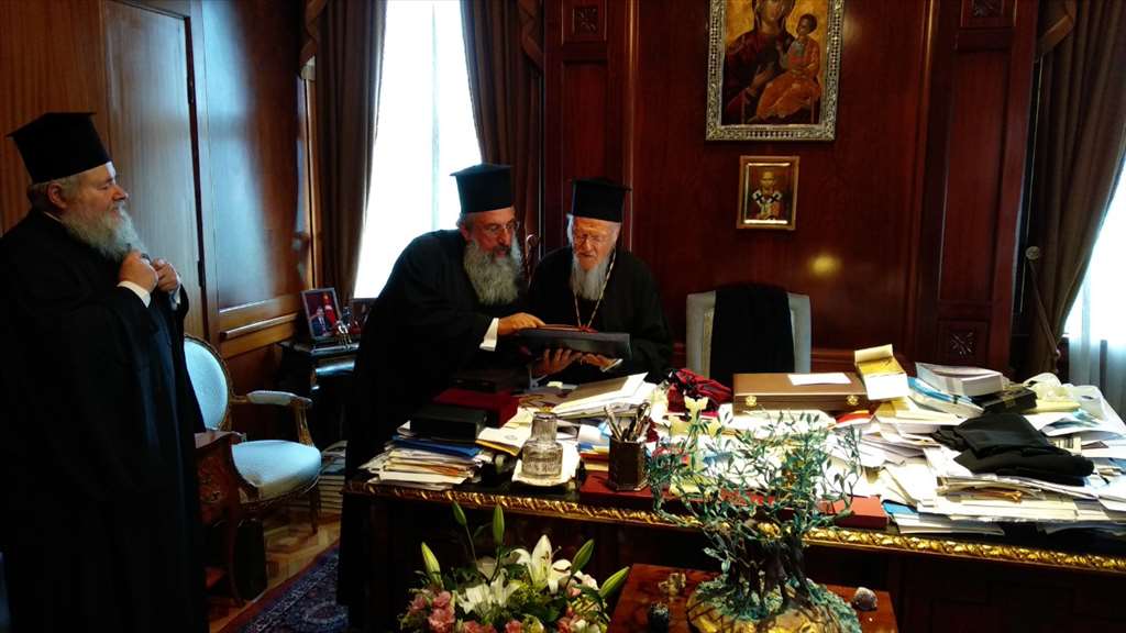 Μετά τό πέρας τῆς Θείας Λειτουργίας τῆς Ἑορτῆς τῶν Ἁγίων Ἀποστόλων Βαρθολομαίου καί Βαρνάβα, καί τῆς τελεσθείσης Πατριαρχικῆς Χοροστασίας ἐν τῷ Πανσέπτῳ Πατριαρχικῷ Ναῷ Ἁγίου Γεωργίου, ὁ Παναγιώτατος ἐδέξατο τήν Ἀντιπροσωπείαν ἐν τῷ Γραφείῳ Αὐτοῦ, ὅπου ἤκουσεν τήν προσφώνησιν τοῦ Σεβ. Μητροπολίτου Κυδωνίας καί Ἀποκορώνου κ. Δαμασκηνοῦ, ὁ ὁποῖος, διά τῆς ἐμπνευσμένης αὐτοῦ προσλαλιᾶς, ὑπέβαλε τόν σεβασμόν, τήν ἀφοσίωσιν καί τά ἑόρτια σεβάσματα τῆς Ἱεραρχίας, τοῦ Ἱεροῦ Κλήρου, τῶν Μοναστικῶν Ἀδελφοτήτων καί τοῦ εὐσεβοῦς Λαοῦ τῆς Ἐκκλησίας Κρήτης.