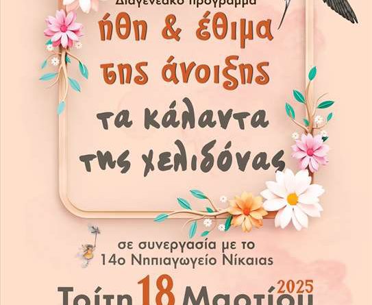 Τα κάλαντα της Χελιδόνας, ένα πανάρχαιο ανοιξιάτικο έθιμο που σηματοδοτεί τον ερχομό της άνοιξης και της αναγέννησης της φύσης θα αναβιώσουν την Τρίτη 18 Μαρτίου, το Α’ και Β’ ΚΑΠΗ Νίκαιας σε συνεργασία με το 14ο Νηπιαγωγείο Νίκαιας. Με τραγούδια και χορούς, μικροί και μεγάλοι θα ξεκινήσουν από τον πεζόδρομο της Κιλικίας και μεταφέροντας το χαρμόσυνο μήνυμα της άνοιξης, θα καταλήξουν στο Δημαρχείο Νίκαιας (Π. Τσαλδάρη 10).