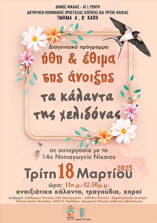 Τα κάλαντα της Χελιδόνας, ένα πανάρχαιο ανοιξιάτικο έθιμο που σηματοδοτεί τον ερχομό της άνοιξης και της αναγέννησης της φύσης θα αναβιώσουν την Τρίτη 18 Μαρτίου, το Α’ και Β’ ΚΑΠΗ Νίκαιας σε συνεργασία με το 14ο Νηπιαγωγείο Νίκαιας. Με τραγούδια και χορούς, μικροί και μεγάλοι θα ξεκινήσουν από τον πεζόδρομο της Κιλικίας και μεταφέροντας το χαρμόσυνο μήνυμα της άνοιξης, θα καταλήξουν στο Δημαρχείο Νίκαιας (Π. Τσαλδάρη 10).