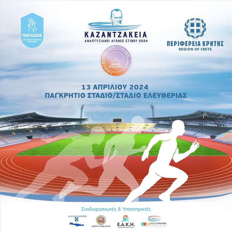Οι αγώνες Στίβου "Καζαντζάκεια 2024", έχουν συμπεριληφθεί στο καλεντάρι της Παγκόσμιας Ομοσπονδίας Στίβου (World Athletics) και γίνονται με την υποστήριξη της Περιφέρειας Κρήτης, της ΕΑΣ ΣΕΓΑΣ ΚΡΗΤΗΣ, της Ανάπτυξης Αθλητισμού Ηρακλείου, του Εθνικού Αθλητικού Κέντρου Ηρακλείου και του Συνδέσμου Κριτών Νομού Ηρακλείου.