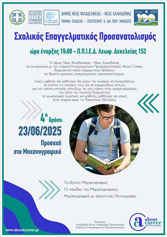 Τον κύκλο δωρεάν ενημερωτικών δράσεων Σχολικού Επαγγελματικού Προσανατολισμού διοργάνωσε και πραγματοποιεί ο Δήμος Νέας Φιλαδέλφειας-Νέας Χαλκηδόνας, σε συνεργασία με την εταιρεία Επαγγελματικού Προσανατολισμού About Career, με σκοπό να βοηθήσει μαθητές/τριες και γονείς να κατανοήσουν και να γνωρίσουν τον τρόπο που θα επιλέξουν τη μελλοντική επαγγελματική τους πορεία, μέσα σε έναν κόσμο που διαρκώς αλλάζει.