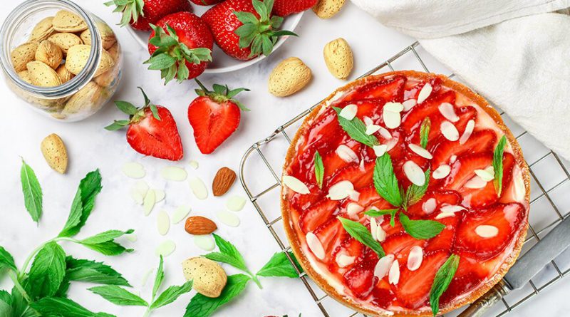 Όταν η βάση της τάρτας κρυώσει, απλώστε την κρέμα από πάνω. Κόψτε τις φράουλες σε φέτες και τοποθετήστε τις από πάνω. Βάλτε τη μαρμελάδα σε ένα κατσαρολάκι με μερικές κουταλιές της σούπας νερό και σιγοβράστε την μέχρι να γίνει ένα λείο γλάσο. Περάστε με ένα πινέλο τις φράουλες.