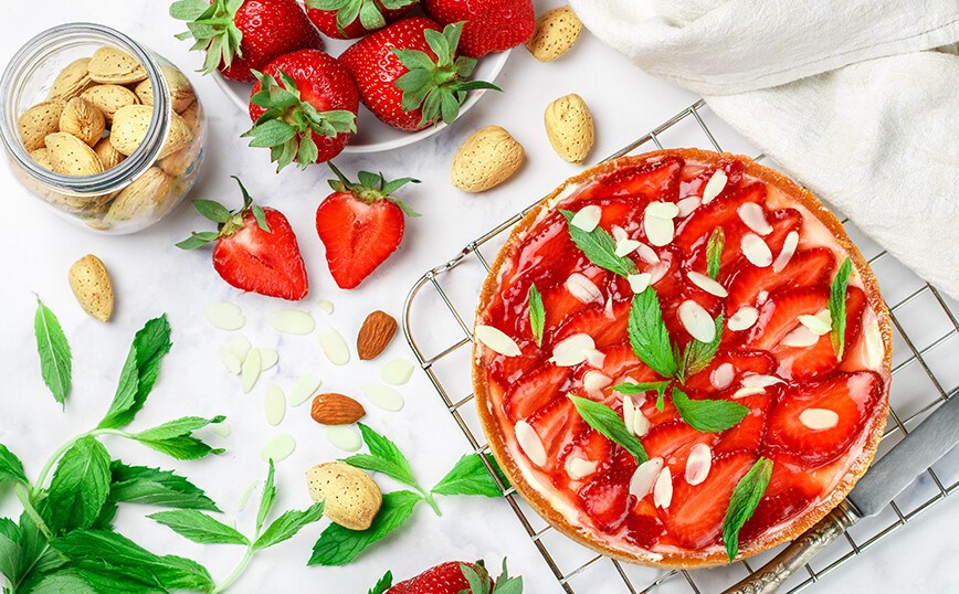 Όταν η βάση της τάρτας κρυώσει, απλώστε την κρέμα από πάνω. Κόψτε τις φράουλες σε φέτες και τοποθετήστε τις από πάνω. Βάλτε τη μαρμελάδα σε ένα κατσαρολάκι με μερικές κουταλιές της σούπας νερό και σιγοβράστε την μέχρι να γίνει ένα λείο γλάσο. Περάστε με ένα πινέλο τις φράουλες.
