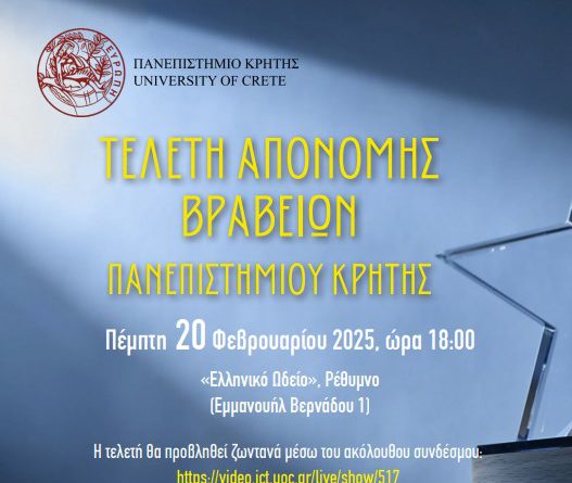 Το Πανεπιστήμιο Κρήτης διοργανώνει την τελετή απονομής των Βραβείων «Άριστης Διδακτορικής Διατριβής», «Νέου Ερευνητή», «Έρευνας» και «Κοινωνικής Προσφοράς» για τα ακαδημαϊκά έτη 2022, 2023 και 2024.