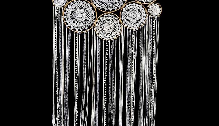 Ονειροπαγίδα πλεκτή τύπου κουρτίνα, σε λευκό χρώμα, πολύ μεγάλου μεγέθους με στεφάνια από μπαμπού και κρόσσια για τη διακόσμηση του σπιτιού σας ή ακόμη και για τον στολισμό χώρων σε εκδηλώσεις. Αποτελείται απο 8 ονειροπαγίδες σε διάφορα μεγέθη. Διαστάσεις 200×80 εκ.