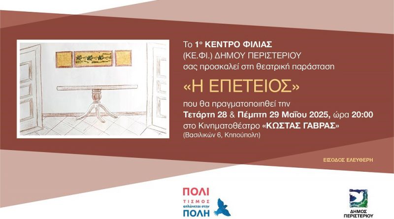 Το 1ο Κέντρο Φιλίας (ΚΕ.ΦΙ.) του Δήμου Περιστερίου σας προσκαλεί στη θεατρική παράσταση «Η Επέτειος», μία ξεχωριστή καλλιτεχνική δημιουργία που φέρει τη σφραγίδα των μελών του Κέντρου και πραγματοποιείται με μεράκι και αγάπη για το θέατρο.