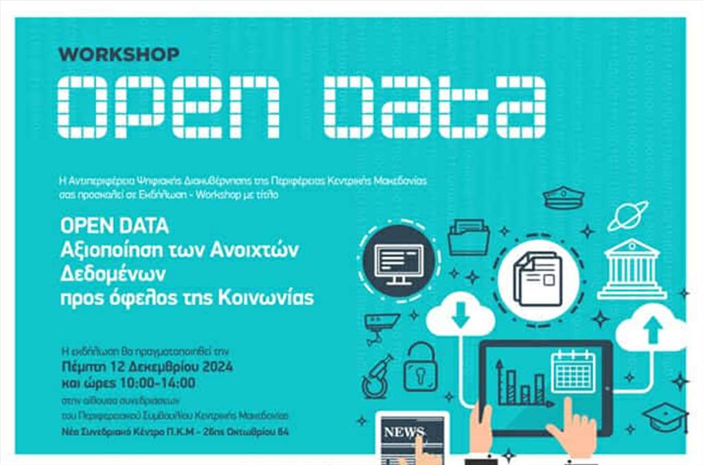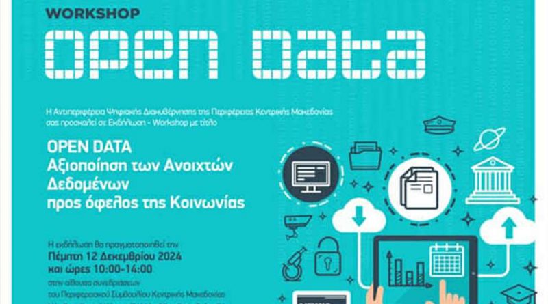 Ημερίδα για την αξιοποίηση των ανοιχτών δεδομένων (open data) προς όφελος της κοινωνίας διοργανώνει η Περιφέρεια Κεντρικής Μακεδονίας, μέσω της Αντιπεριφέρειας Ψηφιακής Διακυβέρνησης. Η εκδήλωση, που τελεί υπό την αιγίδα του Υπουργείου Εσωτερικών (Τομέας Μακεδονίας και Θράκης), θα πραγματοποιηθεί την Πέμπτη 12 Δεκεμβρίου 2024, από τις 10.00 το πρωί έως τις 2.00 το μεσημέρι, στην αίθουσα συνεδριάσεων του Περιφερειακού Συμβουλίου Κεντρικής Μακεδονίας στο Κτίριο Υπηρεσιών της Περιφέρειας (26ης Οκτωβρίου 64, Θεσσαλονίκη – Νέο Συνεδριακό Κέντρο Π.Κ.Μ.).