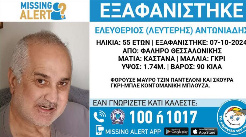Συναγερμός έχει σημάνει στις Αρχές για την εξαφάνιση ενός 55χρονου από την περιοχή του Φαλήρου, στη Θεσσαλονίκη, με το “Χαμόγελο του Παιδιού” να προχωρά στην έκδοση missing alert. Σύμφωνα με τον οργανισμό, πρόκειται για τον Ελευθέριο Αντωνιάδη, τα ίχνη του οποίου χάθηκαν στις 7 Οκτωβρίου. Σύμφωνα με τη σχετική ανακοίνωση, “το Χαμόγελο του Παιδιού προχώρησε άμεσα στη δημοσιοποίηση των στοιχείων του ενήλικου, κατόπιν αιτήματος της οικογένειας του, καθώς ενδέχεται να συντρέχουν λόγοι οι οποίοι θέτουν τη ζωή του σε κίνδυνο”.