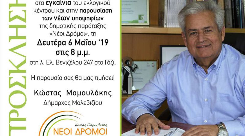 Με μια ανοιχτή εκδήλωση τη Δευτέρα 6 Μαΐου 2019, στις 8 μ.μ., στα γραφεία της δημοτικής παράταξης «Νέοι Δρόμοι» στο Γάζι (Ελ. Βενιζέλου 247), ο Κώστας Μαμουλάκης παρουσιάζει το νέο ψηφοδέλτιο της παράταξης εν’ όψη των δημοτικών εκλογών.