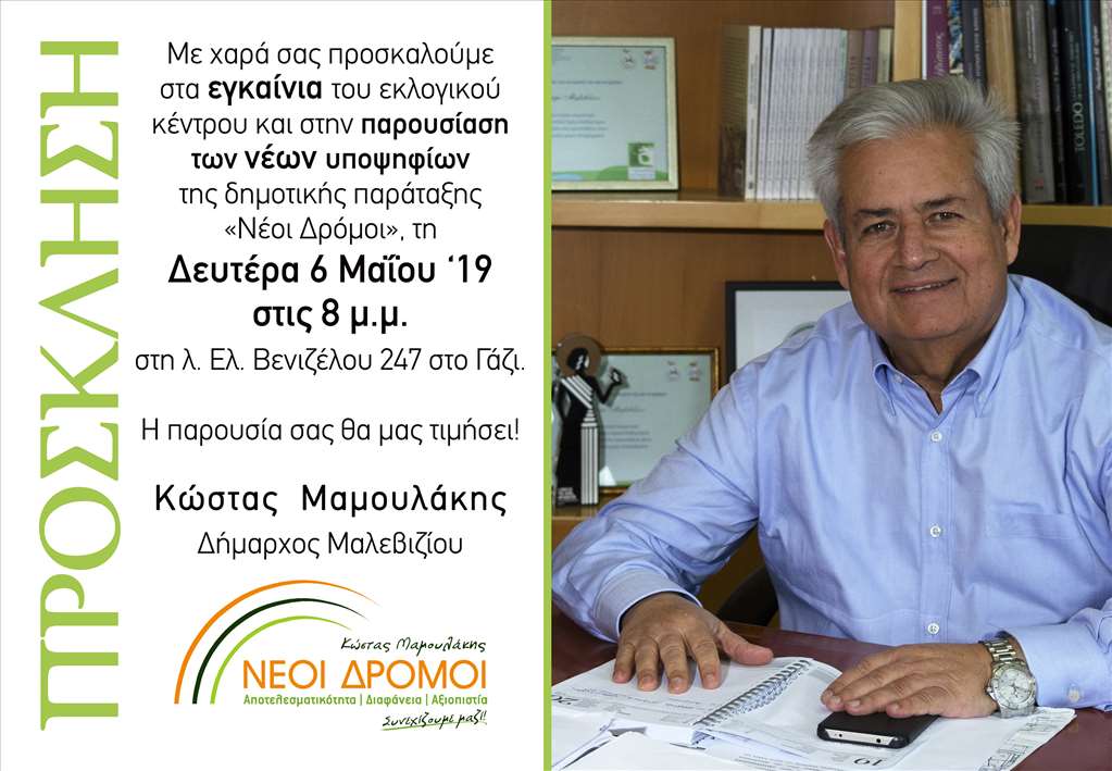 Με μια ανοιχτή εκδήλωση τη Δευτέρα 6 Μαΐου 2019, στις 8 μ.μ., στα γραφεία της δημοτικής παράταξης «Νέοι Δρόμοι» στο Γάζι (Ελ. Βενιζέλου 247), ο Κώστας Μαμουλάκης παρουσιάζει το νέο ψηφοδέλτιο της παράταξης εν’ όψη των δημοτικών εκλογών.