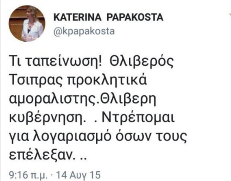 ΤΙ ΕΙΧΕ ΓΡΑΨΕΙ ΣΤΟ ΠΑΡΕΛΘΟΝ ΚΑΤΑ ΤΟΥ ΑΛΕΞΗ ΤΣΙΠΡΑ Τα tweets για τα οποία μετανιώνει σήμερα η Κατερίνα Παπακώστα [εικόνες]