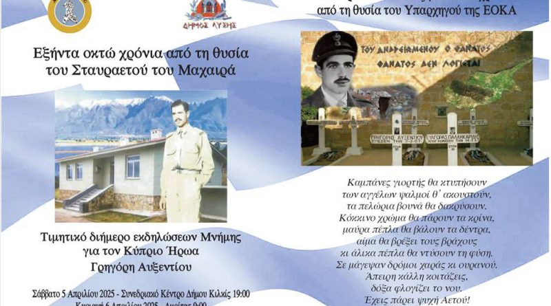 Οι αδελφοποιημένοι Δήμοι Κιλκίς και Λύσης Κύπρου τιμούν τη μνήμη του Κύπριου Ήρωα και υπαρχηγού της Εθνικής Οργάνωσης Κυπρίων Αγωνιστών (Ε.Ο.Κ.Α.) Γρηγόρη Αυξεντίου με διήμερο εκδηλώσεων που θα πραγματοποιηθεί το Σάββατο 5 και την Κυριακή 6 Απριλίου σε Κιλκίς και Ακρίτα.