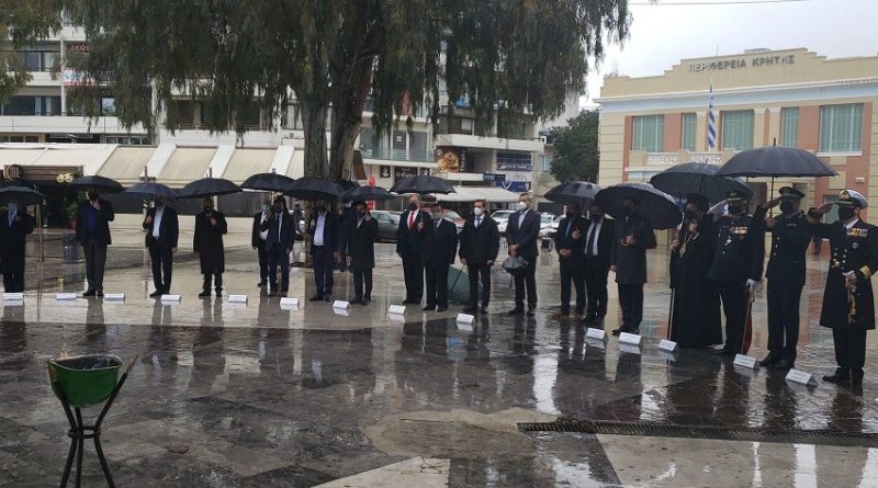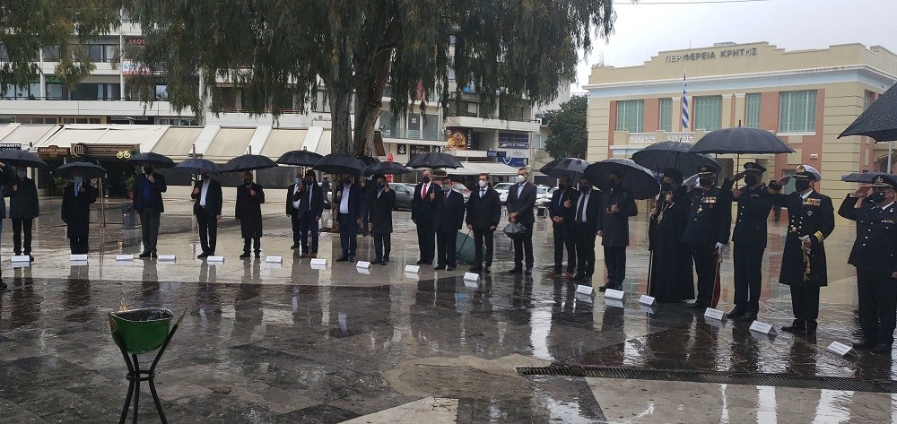 Νωρίτερα πραγματοποιήθηκε επίσημη Δοξολογία στον Μητροπολιτικό Ναό του Αγ. Μηνά χοροστατούντος του Θεοφιλεστάτου Επισκόπου Κνωσού κ. Προδρόμου, ενώ τον πανηγυρικό της ημέρας εκφώνησε η καθηγήτρια φιλολογίας Χρυσάνθη Καμπουράκη. Παρόντες ήταν ο Πρόεδρος του Περιφερειακού Συμβουλίου Κρήτης Παύλος Μπαριτάκης, ο Αντιπεριφερειάρχης της Π.Ε. Ηρακλείου Νίκος Συριγωνάκης, Περιφερειακοί, Δημοτικοί Σύμβουλοι και άλλοι θεσμικοί εκπρόσωποι.