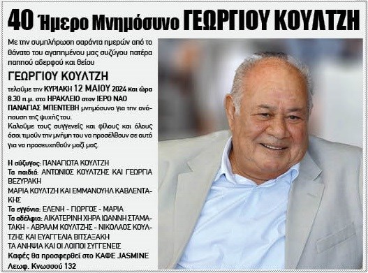 Με την συμπλήρωση σαράντα ημερών από το θάνατο του αγαπημένου μας συζύγου πατέρα παππού αδερφού και θείου ΓΕΩΡΓΙΟΥ ΚΟΥΛΤΖΗ τελούμε την ΚΥΡΙΑΚΗ 12 ΜΑΙΟΥ 2024 και ώρα 8.30 π.μ. στο ΗΡΑΚΛΕΙΟ στον ΙΕΡΟ ΝΑΟ ΠΑΝΑΓΙΑΣ ΜΠΕΝΤΕΒΗ μνημόσυνο για την ανάπαυση της ψυχής του.
