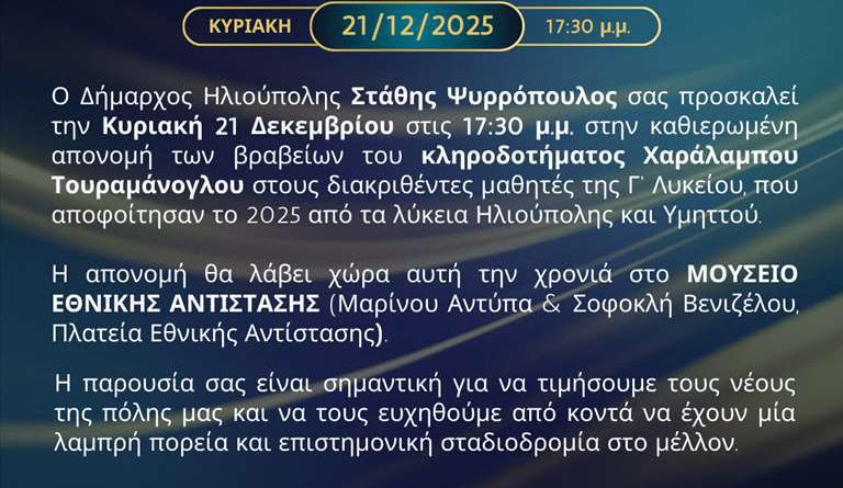 Ο Δήμαρχος Ηλιούπολης Στάθης Ψυρρόπουλος σας προσκαλεί την Κυριακή 21 Δεκεμβρίου στις 17:30 μ.μ. στην καθιερωμένη απονομή των βραβείων του κληροδοτήματος Χαράλαμπου Τουραμάνογλου στους διακριθέντες μαθητές της Γ’ Λυκείου, που αποφοίτησαν το 2025 από τα λύκεια Ηλιούπολης και Υμηττού.