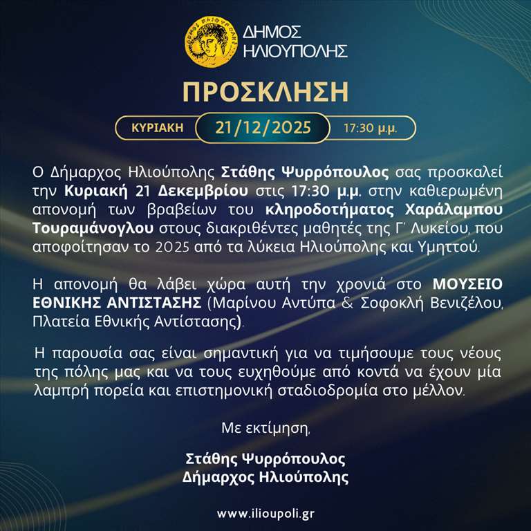 Ο Δήμαρχος Ηλιούπολης Στάθης Ψυρρόπουλος σας προσκαλεί την Κυριακή 21 Δεκεμβρίου στις 17:30 μ.μ. στην καθιερωμένη απονομή των βραβείων του κληροδοτήματος Χαράλαμπου Τουραμάνογλου στους διακριθέντες μαθητές της Γ’ Λυκείου, που αποφοίτησαν το 2025 από τα λύκεια Ηλιούπολης και Υμηττού.