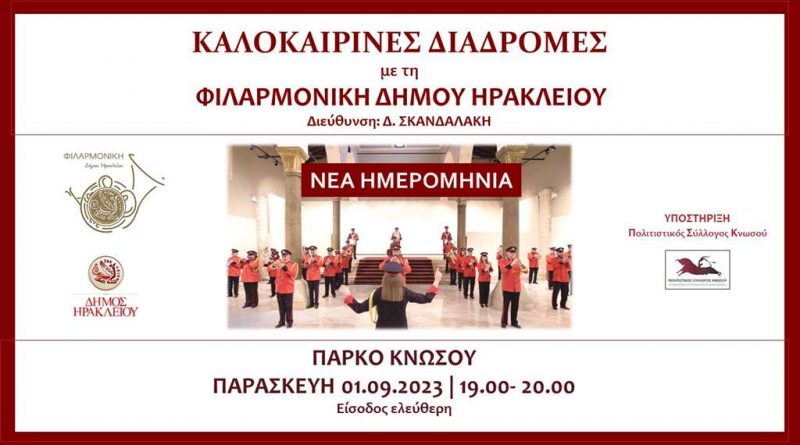 Η Φιλαρμονική του Δήμου Ηρακλείου συνεχίζει τις εμφανίσεις την Παρασκευή 1η Σεπτεμβρίου στο Πάρκο Κνωσού. Μετά από πρόκληση του τοπικού Πολιτιστικού Συλλόγου θα παίξει γνωστές και χαρούμενες μελωδίες για το κοινό.