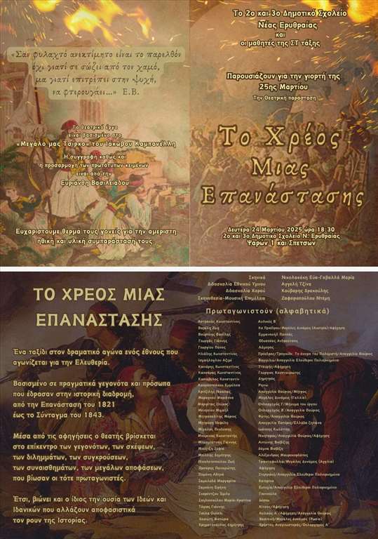 «Το χρέος μιας Επανάστασης» Παράσταση την Δευτέρα 24/3 στο Β’ & Γ’ Δημοτικό Σχολείο Νέας Ερυθραίας