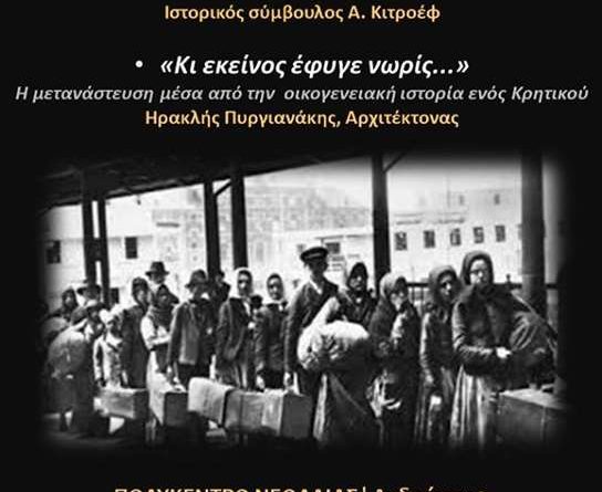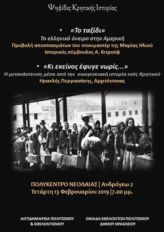 Στο πλαίσιο αυτό αύριο, Τετάρτη 13 Φεβρουαρίου 2019 και ώρα 19:00 στο Πολύκεντρο Νεολαίας του Δήμου Ηρακλείου (Ανδρόγεω 2) θα προβληθούν αποσπάσματα του ντοκιμαντέρ της Μαρίας Ηλιού «Το ταξίδι». Θα ακολουθήσει η ομιλία «Κι εκείνος έφυγε νωρίς…» για τη μετανάστευση μέσα από μια οικογενειακή ιστορία από τον κ. Ηρακλή Πυργιαννάκη.