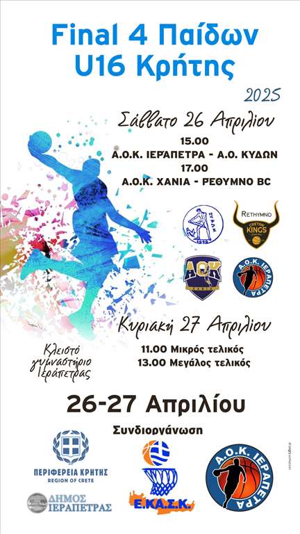 Η Τελική Φάση μπάσκετ των ΠΑΙΔΩΝ Κρήτης (ΕΚΑΣΚ) θα διεξαχθεί το διήμερο 26 και 27/4/2025 στην Ιεράπετρα με την στήριξη της Περιφέρειας Κρήτης.