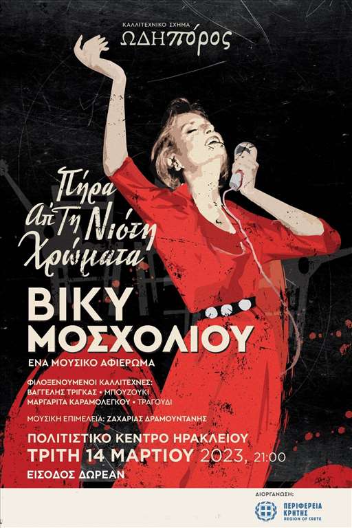 Το Καλλιτεχνικό σχήμα Ωδηπόρος τιμά την μεγάλη ερμηνεύτρια Βίκυ Μοσχολιού την Τρίτη 14 Μαρτίου στο πολιτιστικό συνεδριακό κέντρο Ηρακλείου στις 21:00.