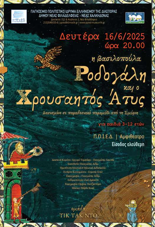 Το Παγκόσμιο Πολιτιστικό Ίδρυμα Ελληνισμού της Διασποράς του Δήμου Νέας Φιλαδέλφειας – Νέας Χαλκηδόνας φιλοξενεί τη θεατρική ομάδα ΤΙΚ ΤΑΚ ΝΤΟ, η οποία τη Δευτέρα 16 Ιουνίου και ώρα 20:00 θα παρουσιάσει το μαγικό μικρασιάτικο παραμύθι "Ροδογάλη", που απευθύνεται σε παιδιά από 3 ετών και στους γονείς τους.