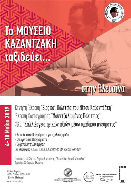 Στο πλαίσιο αυτό και για το χρονικό διάστημα από τις 4 έως τις 18 Μαΐου 2019, στις εγκαταστάσεις του Πολιτιστικού Κέντρου Δήμου Ελευσίνας «Λεωνίδας Κανελλόπουλος», θα φιλοξενηθεί η Κινητή Έκθεση «Βίος και πολιτεία του Νίκου Καζαντζάκη», που σχεδιάστηκε από τον συγγραφέα και γραφίστα Δημήτρη Καλοκύρη και χρηματοδοτήθηκε από τον εφοπλιστή Βαγγέλη Μαρινάκη. Η Έκθεση βασίζεται στις ψηφιακές συλλογές του Μουσείου και, μέσα από κείμενα και ψηφιακές απεικονίσεις χειρόγραφων, φωτογραφιών, εξώφυλλων βιβλίων και άλλου υλικού, παρουσιάζονται σημαντικές πτυχές της ζωής και του έργου του Νίκου Καζαντζάκη.