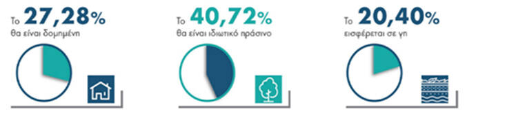 Ειδικότερα στα περίπου 2.600 στρέμματα που πολεοδομούνται, θα οικοδομηθούν 710 στρ., 1.060 στρ. θα είναι ιδιωτικοί χώροι πρασίνου (ακάλυπτοι), και 830 στρ. αποτελούν την εισφορά σε γη, αυξάνοντας τους κοινόχρηστους και κοινωφελείς χώρους στην περιοχή.