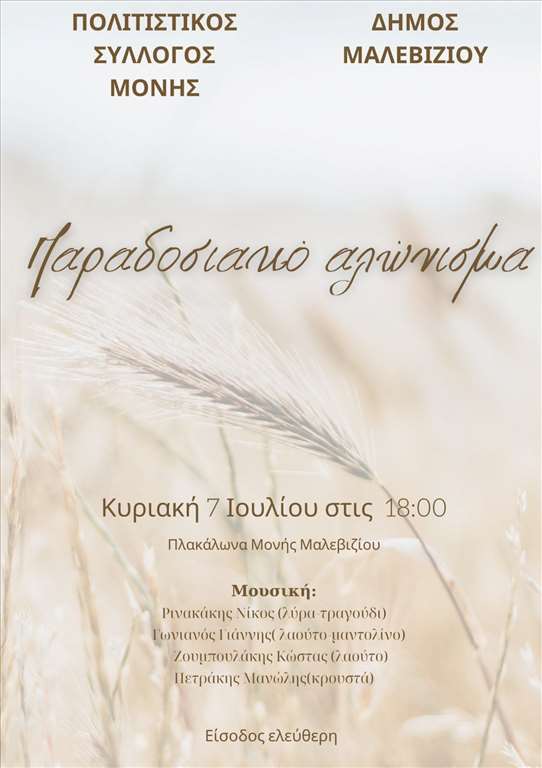 Η εκδήλωση θα πραγματοποιηθεί στη θέση Πλακάλωνα στη Μονή Μαλεβιζίου την Κυριακή στις 18.00 και η είσοδος για το κοινό είναι ελεύθερη.