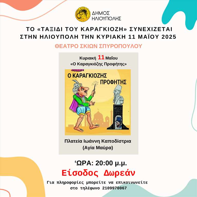 Το «Ταξίδι του Καραγκιόζη» στην Ηλιούπολη για τους μικρούς και μεγάλους φίλους συνεχίζεται την Κυριακή 11 Μαΐου 2025 στις 20:00 μ.μ. με την παράσταση «Ο Καραγκιόζης Προφήτης» στην Πλατεία Ιωάννη Καποδίστρια (Αγία Μαύρα) και ολοκληρώνεται την Κυριακή 25 Μαΐου 2025.