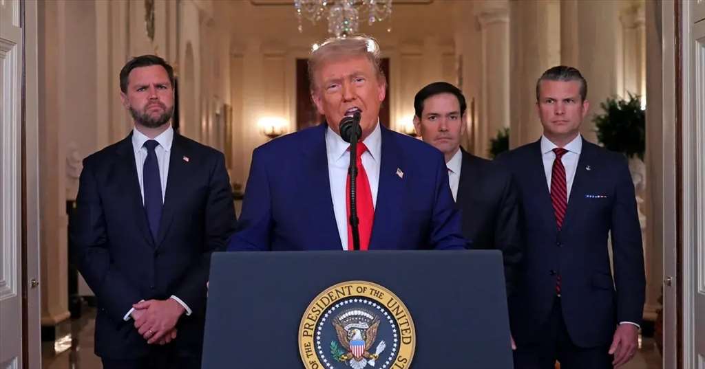 «Απόψε, μπορώ να αναφέρω στον κόσμο ότι τα πλήγματα ήταν μια θεαματική στρατιωτική επιτυχία. Οι βασικές εγκαταστάσεις πυρηνικού εμπλουτισμού του Ιράν έχουν εξαλειφθεί πλήρως και ολοκληρωτικά» δήλωσε, έχοντας δίπλα του τον αντιπρόεδρο Τζέι Ντι Βανς, τον υπουργό Εξωτερικών Μάρκο Ρούμπιο και τον υπουργό Άμυνας, Πιτ Χέγκσεθ.