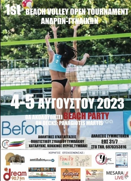Με μεγάλη μας χαρά σας προσκαλούμε την Παρασκευή 4 και το Σάββατο 5 Αυγούστου στις αθλητικές εγκαταστάσεις του Πολιτιστικού Συλλόγου Τυμπακίου στον Κόκκινο Πύργο-Καταλυκή για την διοργάνωση του 1ου Τουρνουά beach Volley Ανδρων-γυναικών.