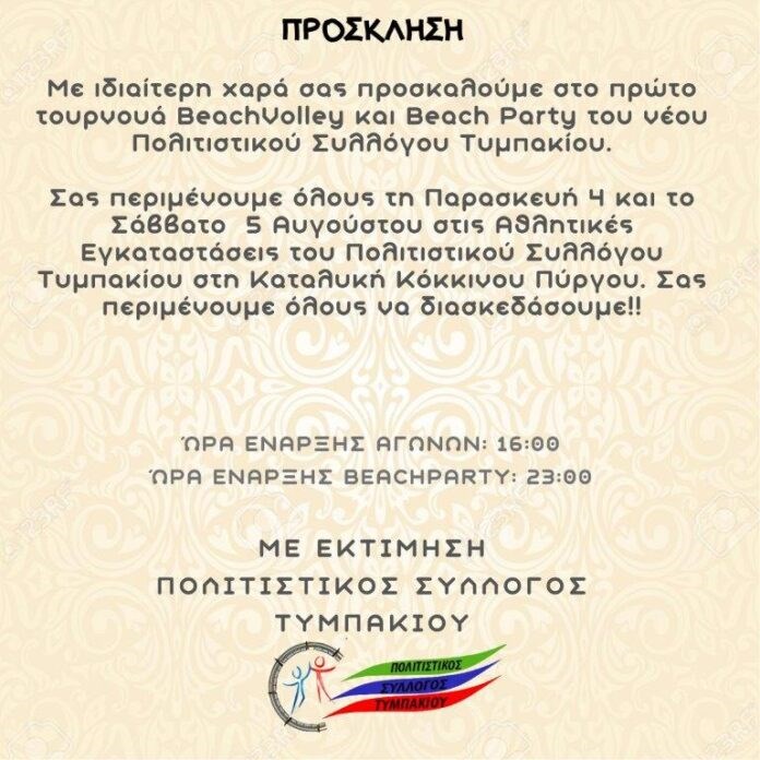 Με μεγάλη μας χαρά σας προσκαλούμε την Παρασκευή 4 και το Σάββατο 5 Αυγούστου στις αθλητικές εγκαταστάσεις του Πολιτιστικού Συλλόγου Τυμπακίου στον Κόκκινο Πύργο-Καταλυκή για την διοργάνωση του 1ου Τουρνουά beach Volley Ανδρων-γυναικών.