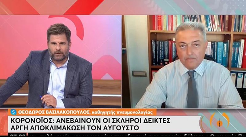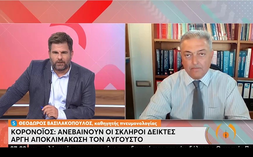 Στην ΕΡΤ εξέφρασε ο καθηγητής Πνευμονολογίας Θεόδωρος Βασιλακόπουλος την εκτίμηση ότι είμαστε στην κορυφή αυτού του επιδημικού κύματος. Από τις επόμενες εβδομάδες θα αρχίσει μια βραδεία αποκλιμάκωση στα κρούσματα του κορονοϊού. Σχολιάζοντας την πορεία της πανδημίας του κορονοϊού στη χώρα τον Ιούλιο αποκάλυψε ότι φτάσαμε να έχουμε τετρακόσιες εισαγωγές στα νοσοκομεία, οι οποίες είναι πολλές για καλοκαίρι.
