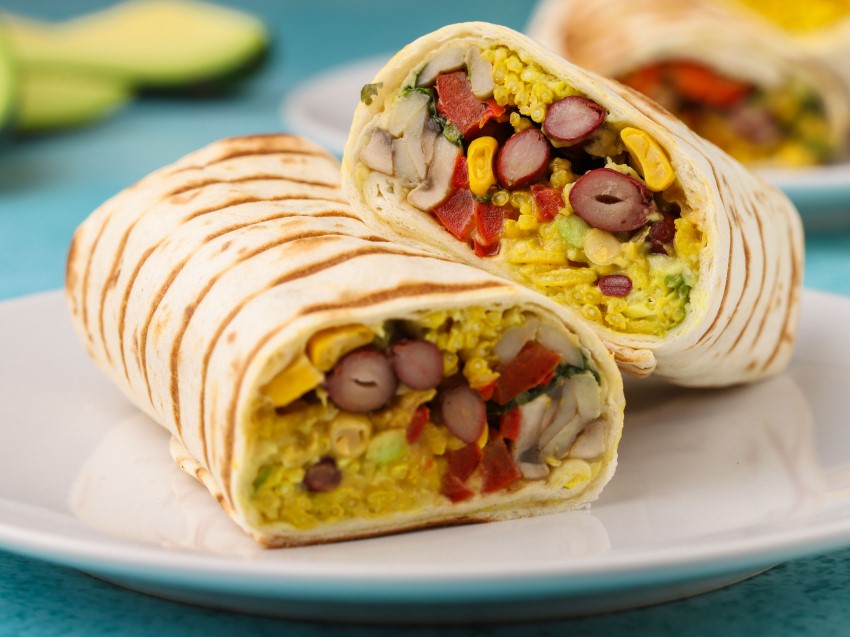 2) Κατόπιν, τοποθετούμε μία τορτίγια στον πάγκο εργασίας, την αλείφουμε ομοιόμορφα με τη μισή ποσότητα guacamole, απλώνουμε από πάνω το μισό ρύζι, λίγο καλαμπόκι, τα μισά φασόλια, λίγες πιπεριές, μερικά μανιτάρια και το ένα φύλλο μαρουλιού.