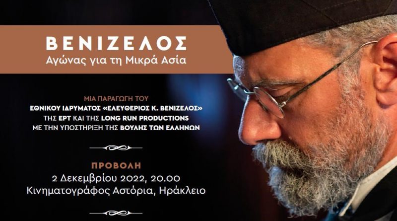 Το δραματοποιημένο ντοκιμαντέρ-συμπαραγωγή του Εθνικού Ιδρύματος Ερευνών και Μελετών «Ελευθέριος Κ. Βενιζέλος», της ΕΡΤ και της Long Run Productions, «ΒΕΝΙΖΕΛΟΣ, αγώνας για τη Μικρά Ασία» θα παρουσιαστεί την Παρασκευή 2 Δεκεμβρίου στις 20:00, στο κινηματοθέατρο ΑΣΤΟΡΙΑ στο Ηράκλειο. Η εκδήλωση διοργανώνεται από το Εθνικό Ίδρυμα «Ελευθέριος Κ. Βενιζέλος» και τη Long Run Productions, με την υποστήριξη της Περιφέρειας Κρήτης και του Δήμου Ηρακλείου.