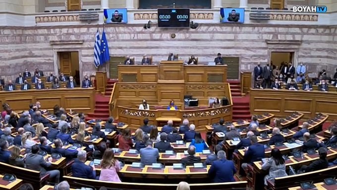 Ο πρόεδρος της Ουκρανίας Βολοντίμιρ Ζελένσκι απηύθυνε ομιλία στο ελληνικό Κοινοβούλιο παρουσία της Προέδρου της Δημοκρατίας Κατερίνας Σακελλαροπούλου.