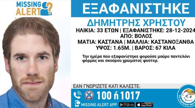 Εξαφανίστηκε από την περιοχή του Βόλου, λίγο μετά τις 12 το μεσημέρι του Σαββάτου, ο 33χρονος Δημήτρης Χρήστου. «Το Χαμόγελο του Παιδιού» ενημερώθηκε για την εξαφάνιση του σήμερα (30 Δεκεμβρίου) και προχώρησε στη δημοσιοποίηση των στοιχείων του, κατόπιν αιτήματος της οικογένειας του, καθώς ενδέχεται να συντρέχουν λόγοι οι οποίοι θέτουν τη ζωή του σε κίνδυνο. Ο Δημήτρης Χρήστου έχει ύψος 1,67 μ., είναι 67 κιλά, έχει καστανόξανθα μαλλιά και καστανά μάτια. Την ημέρα που εξαφανίστηκε φορούσε μαύρο παντελόνι φόρμας και σκούρου χρώματος φούτερ.