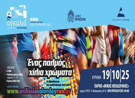 Ο Δήμος Βριλησσίων, σε συνδιοργάνωση με την Περιφέρεια Αττικής, ανακοινώνει τη διεξαγωγή της μεγάλης αθλητικής εκδήλωσης «VRILISSIA COLOR DAY RUN», η οποία θα πραγματοποιηθεί την Κυριακή 19 Οκτωβρίου 2025, από 10:00 έως 13:00, με αφετηρία και τερματισμό το Πάρκο Μίκης Θεοδωράκης (πρώην ΤΥΠΕΤ), στην οδό Π. Μπακογιάννη 38-42.