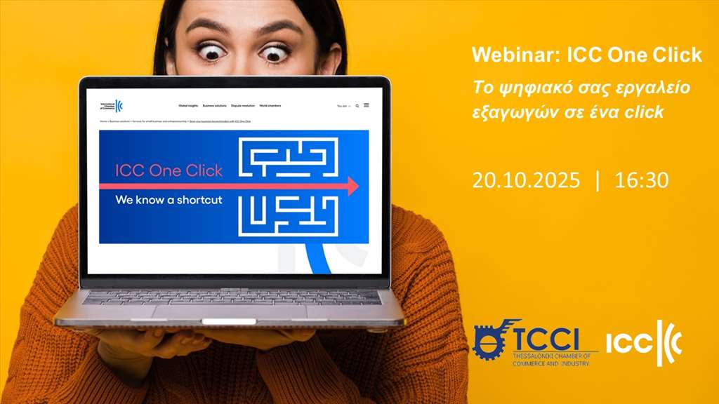 Το Διεθνές Εμπορικό Επιμελητήριο (ICC), σε συνεργασία με το Εμπορικό και Βιομηχανικό Επιμελητήριο Θεσσαλονίκης, διοργανώνουν webinar τη Δευτέρα, 20 Οκτωβρίου και ώρα 16:30, για την παρουσίαση της πλατφόρμας ICC One Click, του καινοτόμου ψηφιακού εργαλείου που υποστηρίζει τις μικρομεσαίες επιχειρήσεις στην επέκτασή τους σε διεθνείς αγορές.