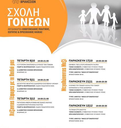 Μέχρι το τέλος Δεκεμβρίου οι συναντήσεις της Σχολής Γονέων του Δήμου Βριλησσίων θα πραγματοποιούνται στο 1ο Δημοτικό Σχολείο Βριλησσίων