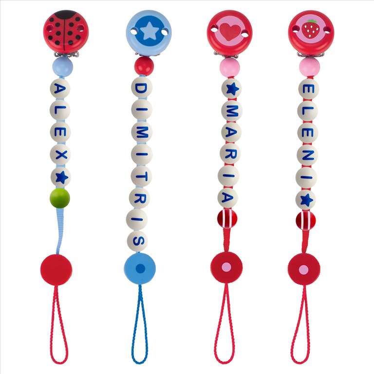 26 γράμματα του λατινικού αλφάβητου σε περιμένουν να τα βάλεις στη σειρά και να σχηματίσεις όποια λέξη θέλεις! Ξύλινο κλιπ πιπίλας σε τέσσερα εντυπωσιακά σχέδια με γράμματα από πλαστικό που κλείνουν με ασφάλεια για να μη μπορούν να καταποθούν από τα μικρά παιδιά. Επέλεξε το σχέδιο της πιπιλιέρας, γράψε το όνομα του ή όποια άλλη λέξη επιθυμείς και δες τη να εμφανίζετα μπροστά σου! Ένα χειροποίητο προσωποποιημένο δώρο για νεογέννητα και μικρά παιδιά.