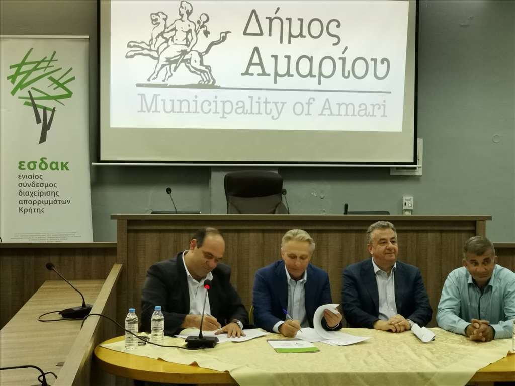 Παρουσία του Περιφερειάρχη Κρήτης κ. Σταύρου Αρναουτάκη, υπεγράφη η σύμβαση μεταξύ του ΕΣΔΑΚ και της αναδόχου εταιρείας που προέκυψε από το σχετικό διαγωνισμό, για την κατασκευή της σύγχρονης Μονάδας Επεξεργασίας Απορριμμάτων (Μ.Ε.Α.) και του Χ.Υ.Τ.Υ Αμαρίου.